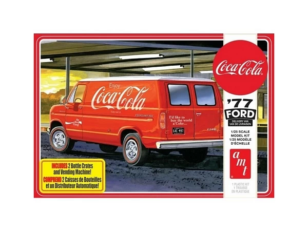 Have a Coke and a smile with AMTās 1/25 scale Ford Van model kit! This authentic service van replica has all the accurate details expected in an AMT kit. This value-packed special version, with its Coca-Cola theme, includes special bonuses: a complete āmini kitā of a vintage 1970s vending machine AND two-scale bottle crates, molded-in authentic Coke bottle green! An authentic decal sheet is included with Coke graphics to decorate the van, vending machine, and crates! Eye-catching illustrated packaging makes this an attractive gift for the Coke collector in your life. A perfect project for a rainy day or anytime! Enjoy the thrill and satisfaction of building something with your hands. Add this AMT kit to your collection today!