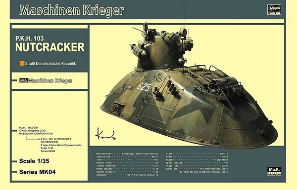 This machine is an unmanned large hover tank developed by the Star Defense Arm for AFS. It has a special heat-resistant ceramic armor that can withstand the mid-infrared laser attack from the enemy AFS, and the turret is a strong robotic cannon equipped with two 6 cm laser cannons. By defeating many enemy AFS (common name: peanuts) and raising battle results, it came to be called by the name of “nuts locker” from enemy ally. The kit faithfully reproduces the original model on 1/35 scale. The bottom hover part is three-dimensionalized the latest setting by supervision by Mr. Hiroshi Yokoyama. Mr. Miki Spikido is in charge of prototype production. The turret can be turned. Rotary laser movable type on the side of the turret. The hatch on the right side of the hover is made as a separate part, and the inner filler opening is reproduced. A smoke discharger is included as an option. Furthermore, “Gustaf” of the same scale and its evolved type “Melzine” are attached! The left arm allows selection of manipulator and excimer high power laser gun. Model kit requires paint and adhesive for assembly.