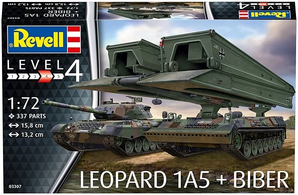 Leopard 1A5 & Bridgelayer “Biber”. This is a 1:72 scale model replica of the Main Battle Tank Leopard 1A5 and the Biber Bridge Laying Tank. The kit contains 337 parts.
