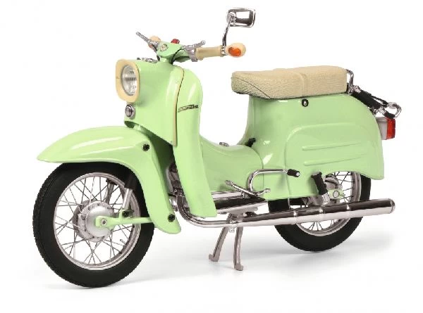 In terms of production quantity, the Simson Swallow is the most successful twowheeler in Germany‘s history with over a million units produced. Manufactured in the „Fahrzeug- und Jagdwaffenwerk Ernst Thälmann“ division within the Simson company in Suhl, from 1964 onwards the swallow was the first model of Simson‘s newly developed series with bird names. Mopeds such as the „sparrow“, „starling“, „sparrow-hawk“ and „hawk“ were also produced in Suhl in considerable numbers. The Simson Swallow KR 51/1 is a brand highlight in the high quality and precision performance Classic Motorcycle Edition 1:10 from Schuco. The series meets the highest quality standards and wows fans with its authentic high-gloss finish. Features such as rotating wheels and fully functional suspension are an integral part of these models and have established them as a firm favourite with motorcycle enthusiasts.