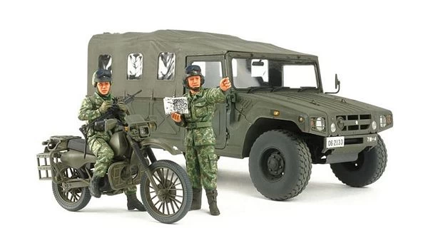 Motorcycles are an important part of Japan Ground Self Defense Force (JGSDF) reconnaissance units, and to maintain a low profile are usually finished in olive drab with matte black components such as the engine. They are frequently joined by the High Mobility Vehicle, which boasts excellent off-road ability and can transport up to 10 passengers, or be used for carrying supplies.