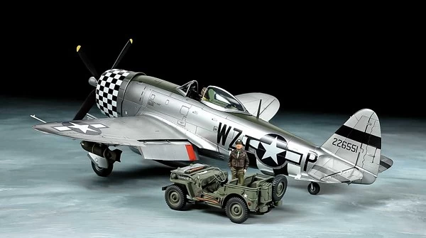 This cost-effective set includes Item 61090 1/48 Republic P-47D Thunderbolt® “Bubbletop” and Item 89755 1/48 U.S.1/4-ton 4×4 Light Vehicle with a special package and new complementary instruction manual, plus one standing officer figure from Item 61089. In May 1941, as the war raged in Europe, a single-engine fighter of more than 4 tons made its first flight. This fighter was the XP-47B, prototype of the Republic P-47 Thunderbolt of which a total of 15,683 units would be built. From the appearance of the P-51 Mustang, the P-47D Thunderbolt showed its power during ground attack missions. The P-47D Thunderbolt “Bubbletop” fitted with the bubble canopy attained fame as a powerful, well-balanced fighter-bomber. The 1/4-ton 4×4 Light Vehicle featured its powerful, lightweight chassis and reliable engine, and even only during WWII, over 600,000 units were produced.