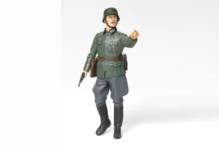 - The officer is holding a Walther P38 pistol in his right hand and giving directions with his left hand.